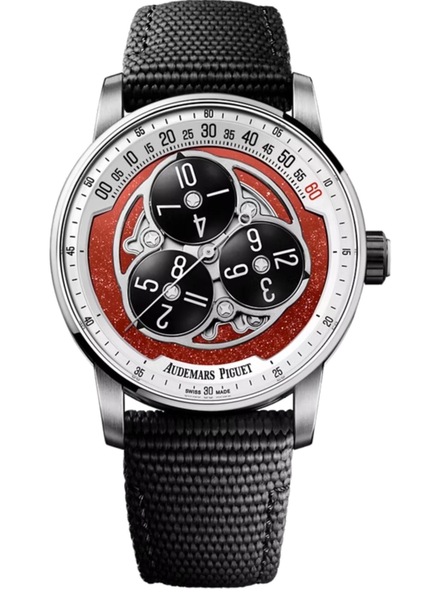 The dial is executed in red aventurine and features a central rhodium-toned wheel. Three black aluminium rotating discs display the hours via white numerals, while the minutes are read against a peripheral scale integrated into the inner bezel. The seconds scale is printed in white and corresponds visually with the numerals on the rotating discs. The Starwheel display replaces a conventional handset with a satellite-style hour indication.