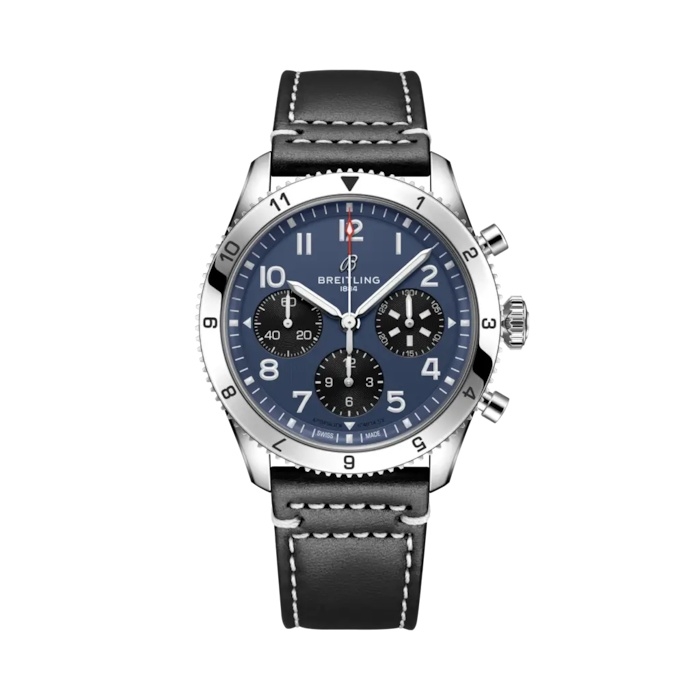 The Breitling Classic Avi Chronograph 42 Yoshi Muroya Limited Edition A233804A1C1X1 debuted in 2025 as a tribute to Japanese air race pilot Yoshihide Muroya. The stainless steel case measures 42 mm across and 14.7 mm in thickness, paired with a bidirectional ratcheted bezel and a screw-down crown. A domed sapphire crystal with double anti-reflective treatment covers the dark blue dial, which is contrasted by black subdials, bold Arabic numerals, and a red chronograph seconds hand. The closed case back is engraved with Muroya’s personal “義” emblem and the individual numbering “ONE OF 50.”