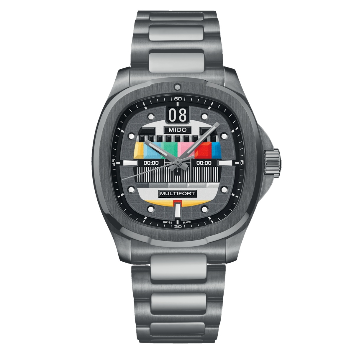 The Mido Multifort TV M049.526.33.081.01, introduced in 2025 as an updated take on the 2023 original 'S01E01'. For this second episode, the TV-shaped case has a grey PVD-coated finish, which is paired with an updated take on the test card-inspired dial design. This watch is powered by the self-winding caliber C07.651, a 'Powermatic' movement with 80 hours of power reserve.Q
