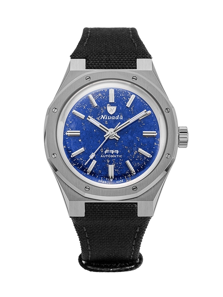 The Nivada Grenchen F77 68017A77-BC is based on a 1977 original. This watch has a titanium case of 37.00mm and a lapis lazuli dial. It is powered by caliber P024 ND (No-Date).