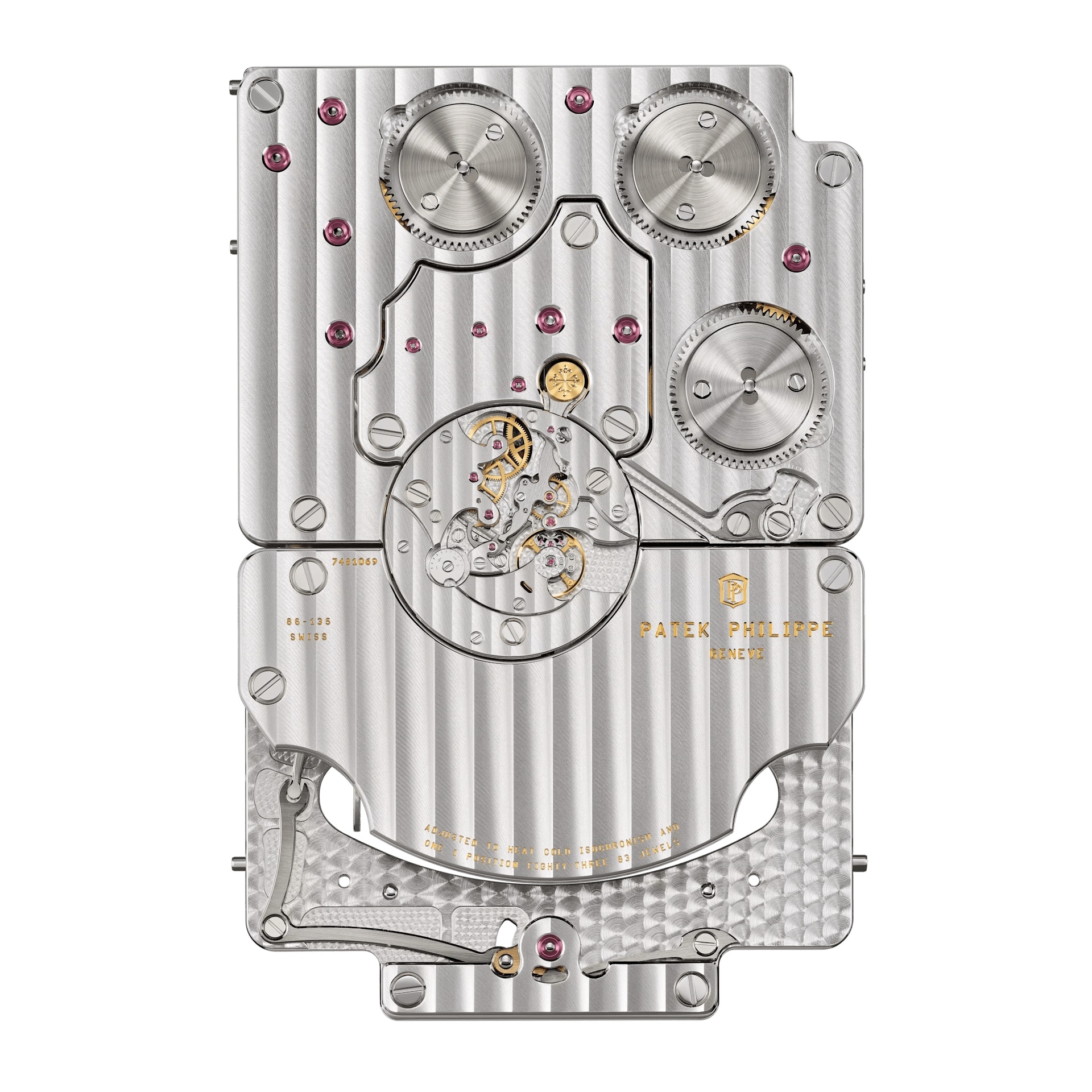 The Patek Philippe calibre 86-135 PEND S IRM Q SE is a manually wound manufacture movement developed specifically for complicated desk clocks. The rectangular movement measures 135 × 86 mm and has a height of 28.55 mm. It consists of 912 components, is fitted with 83 jewels, and delivers a power reserve of 31 days.