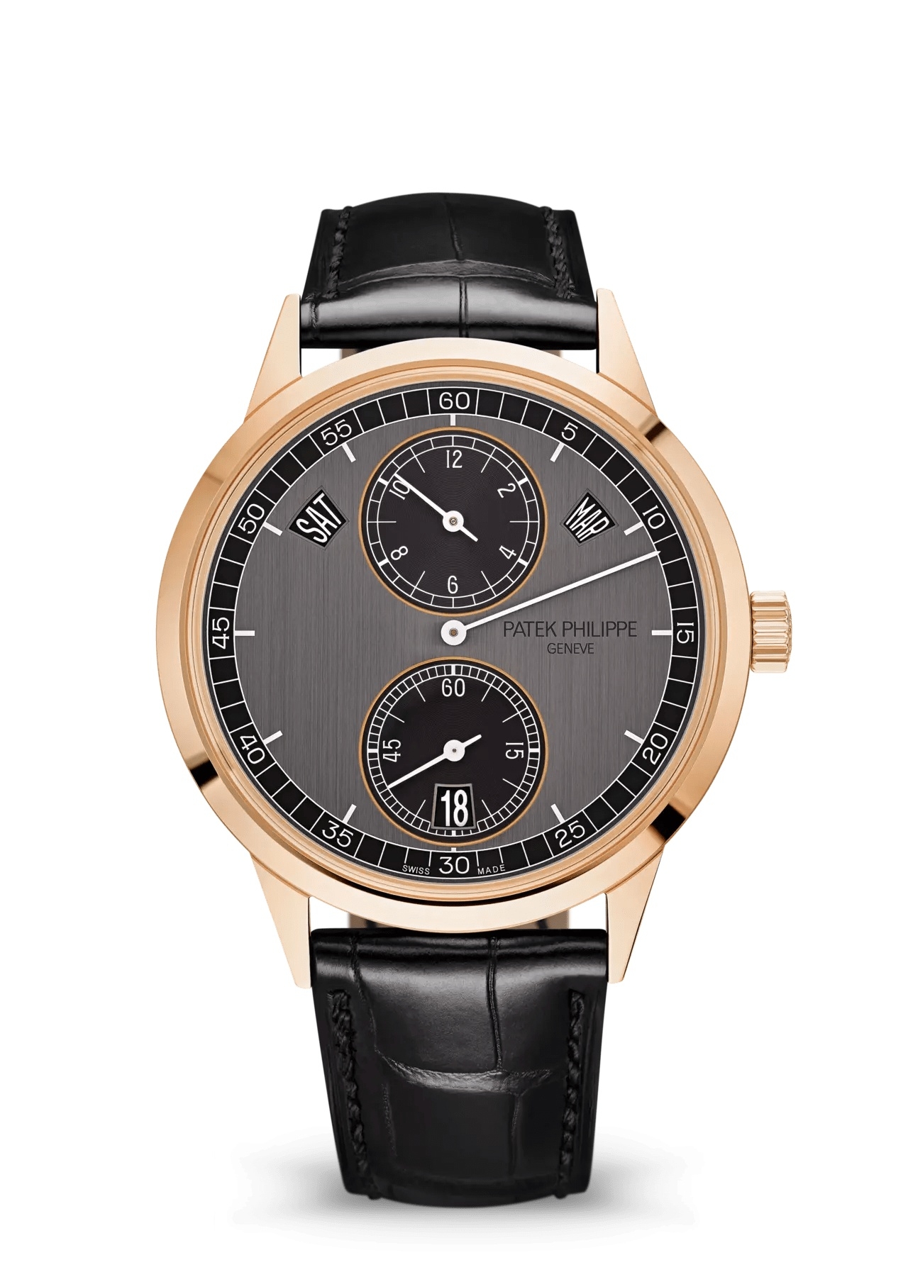 The Patek Philippe Annual Calendar Regulator Ref. 5235/50R-001 debuted in 2019 and presents the brand’s patented annual calendar complication in a regulator-style layout. The rose gold case measures 40.5 mm in diameter and is paired with a vertically satin-brushed two-tone dial in graphite and ebony black, featuring a central minutes hand with separate subdials for the hours and small seconds.