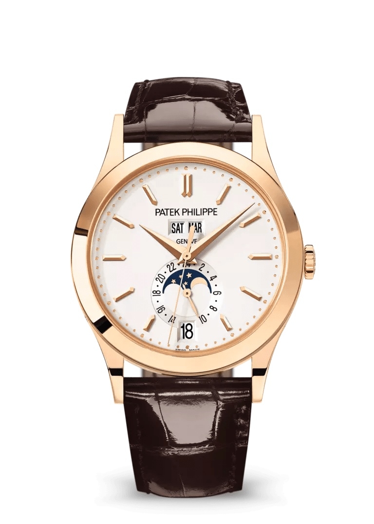 The Patek Philippe 5396 uses the original Calatrava style case paired with an automatic movement with annual calendar. The present example, ref. 5396R-011, features a rose gold case and a silvery opaline dial.