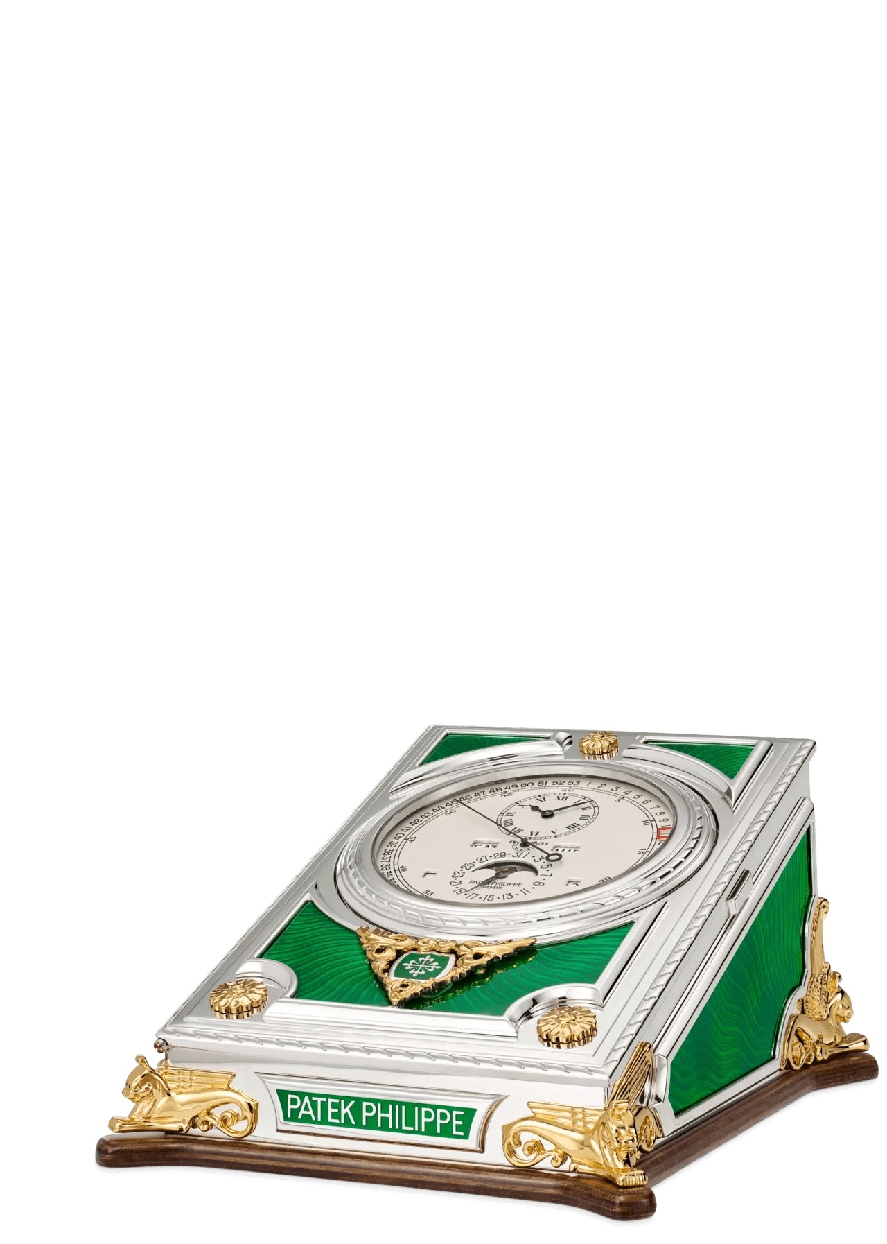 The Patek Philippe Reference 27000M-001 debuted in 2025 as a complicated desk clock combining perpetual calendar functionality with extended autonomy and traditional handcrafts. The rectangular cabinet is manufactured from sterling silver and measures 164.6 × 125 mm, with an overall thickness of 76.73 mm. The exterior is decorated with green Grand Feu flinqué enamel panels, guilloched with a swirling pattern, and accented by vermeil decorative elements. The clock is protected against humidity and dust but is not water-resistant.