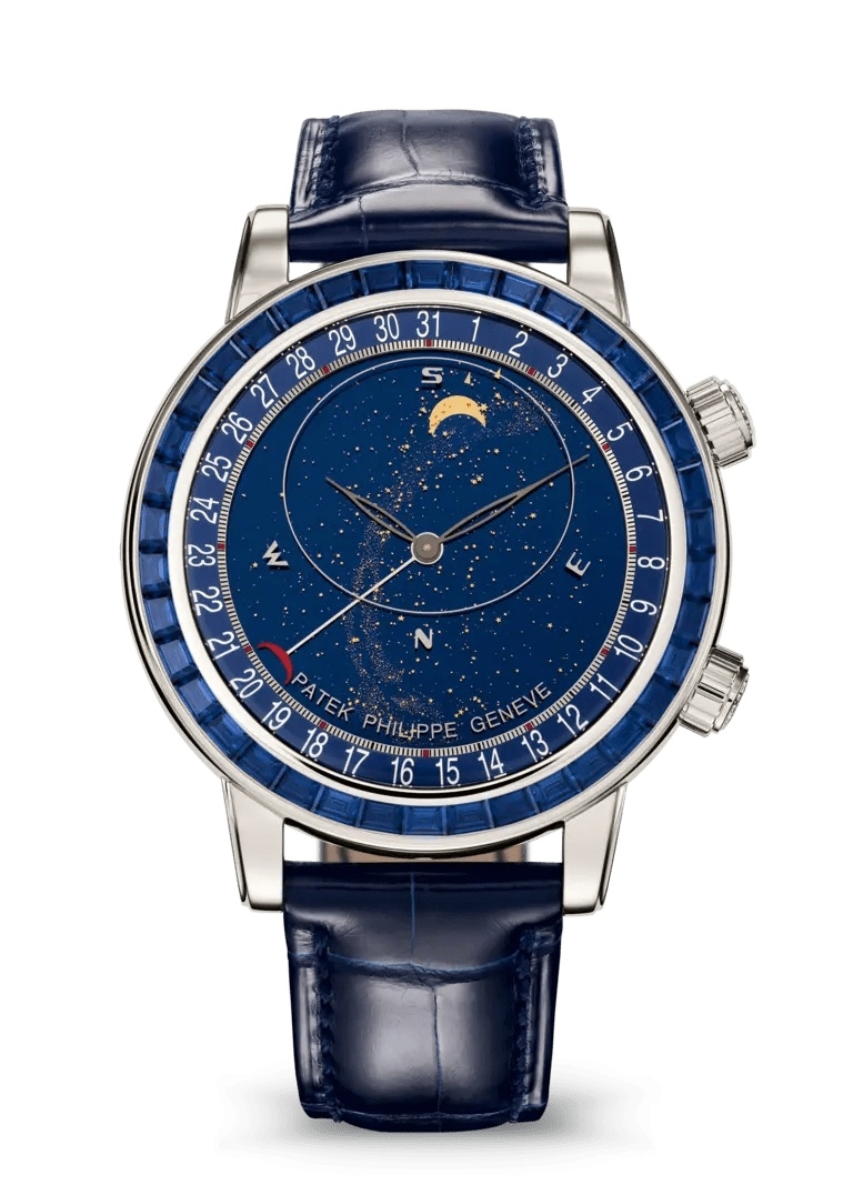 The Patek Philippe Celestial 6104/11P-010 is a jewellery execution of the Celestial astronomical wristwatch, distinguished by sapphire setting in place of diamonds.