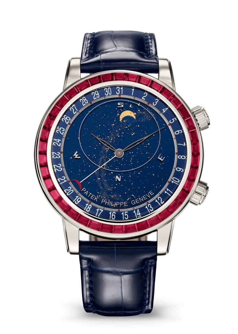 The Patek Philippe Celestial 6104/12P-010 is a jewellery execution of the Celestial astronomical wristwatch, distinguished by ruby setting applied to the case, bezel, and clasp.