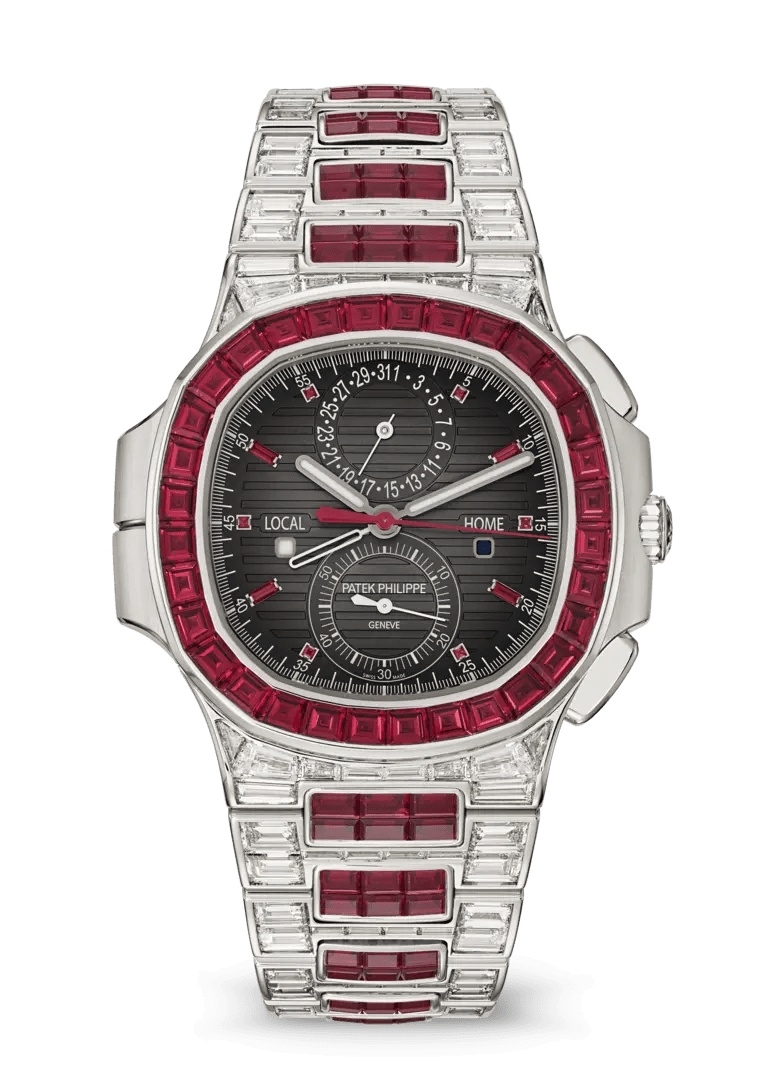 The Patek Philippe Nautilus Flyback Chronograph Travel Time 5990/1422G-001 is a Haute Joaillerie execution of the Nautilus combining a flyback chronograph with a dual time-zone display, distinguished by ruby and diamond setting.