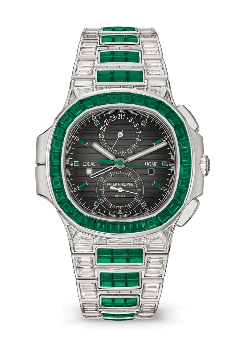 The Patek Philippe Nautilus Flyback Chronograph Travel Time 5990/1423G-001 is a Haute Joaillerie execution of the Nautilus combining a flyback chronograph with a dual time-zone display, set with diamonds and emeralds.