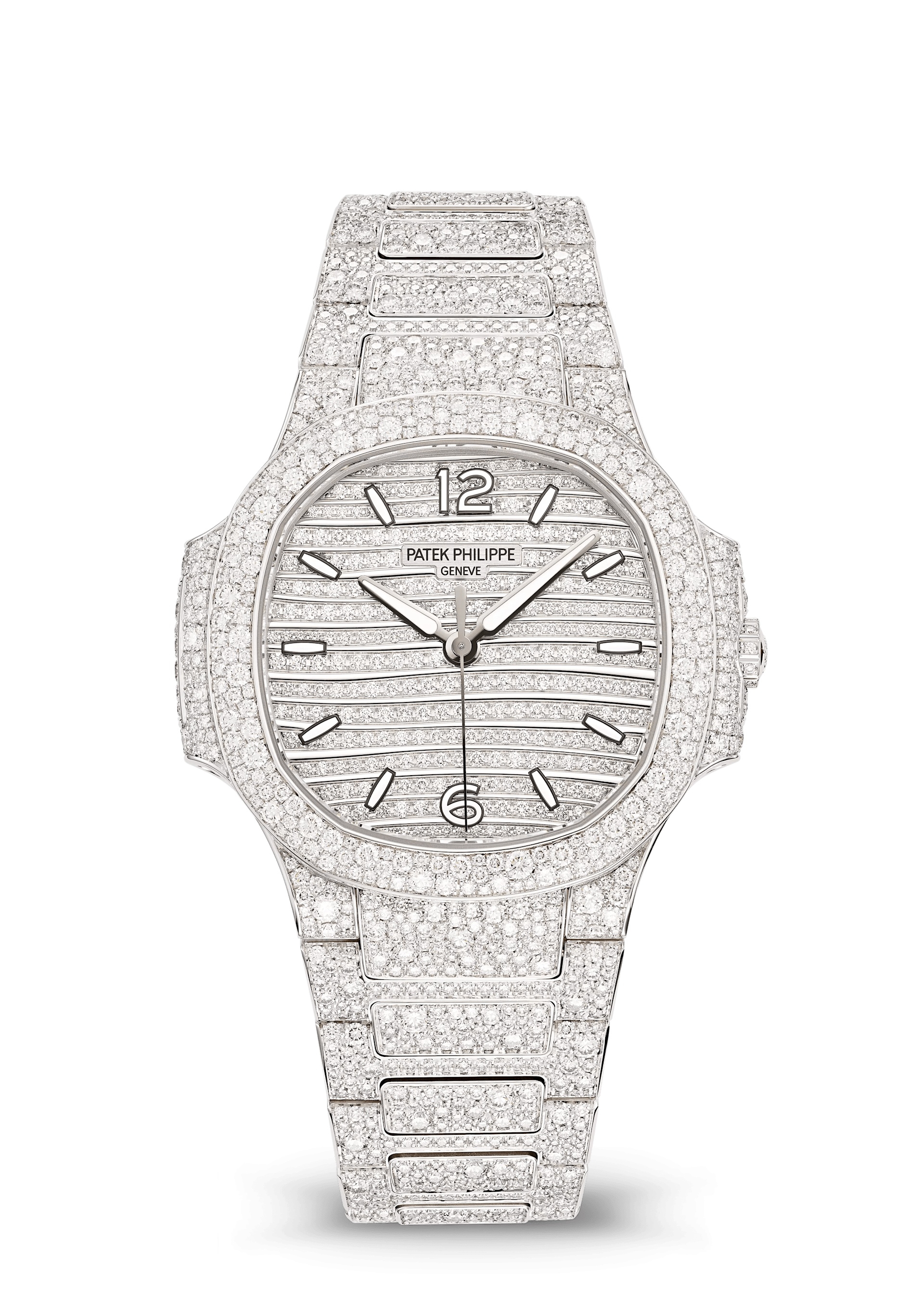 The Patek Philippe Nautilus 7118/1450G-001 debuted in 2021. This Haute Joaillerie ladies’ model is crafted in 18k white gold and measures 35.2 mm in diameter with a thickness of 8.62 mm. Sapphire crystals are fitted to both front and back, and water resistance is specified at 30 meters. The case, bezel, and bracelet are entirely pavé-set using the snow-setting technique with 2,364 brilliant-cut diamonds totaling approximately 11.63 carats.