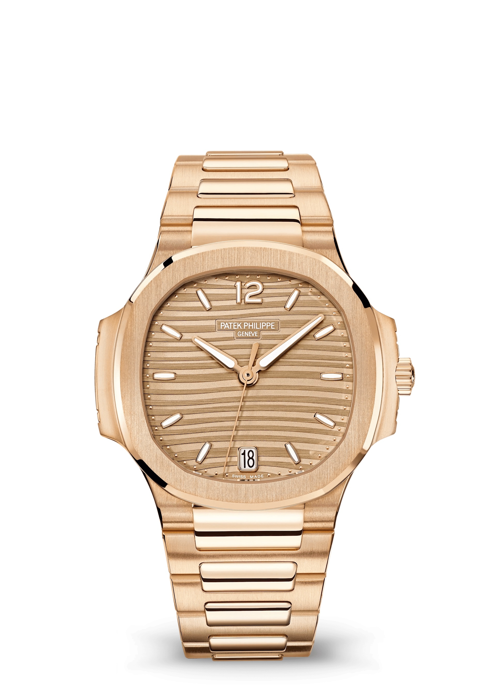 The Patek Philippe Nautilus 7118/1R-010 debuted in 2022. This ladies’ model is housed in an 18k rose gold case measuring 35.2 mm in diameter and 8.62 mm in thickness. Sapphire crystals are fitted to both front and back, and water resistance is specified at 60 meters. The case integrates with an 18k rose gold bracelet, alternating polished and satin-brushed surfaces, secured by a patented fold-over clasp with adjustment system.