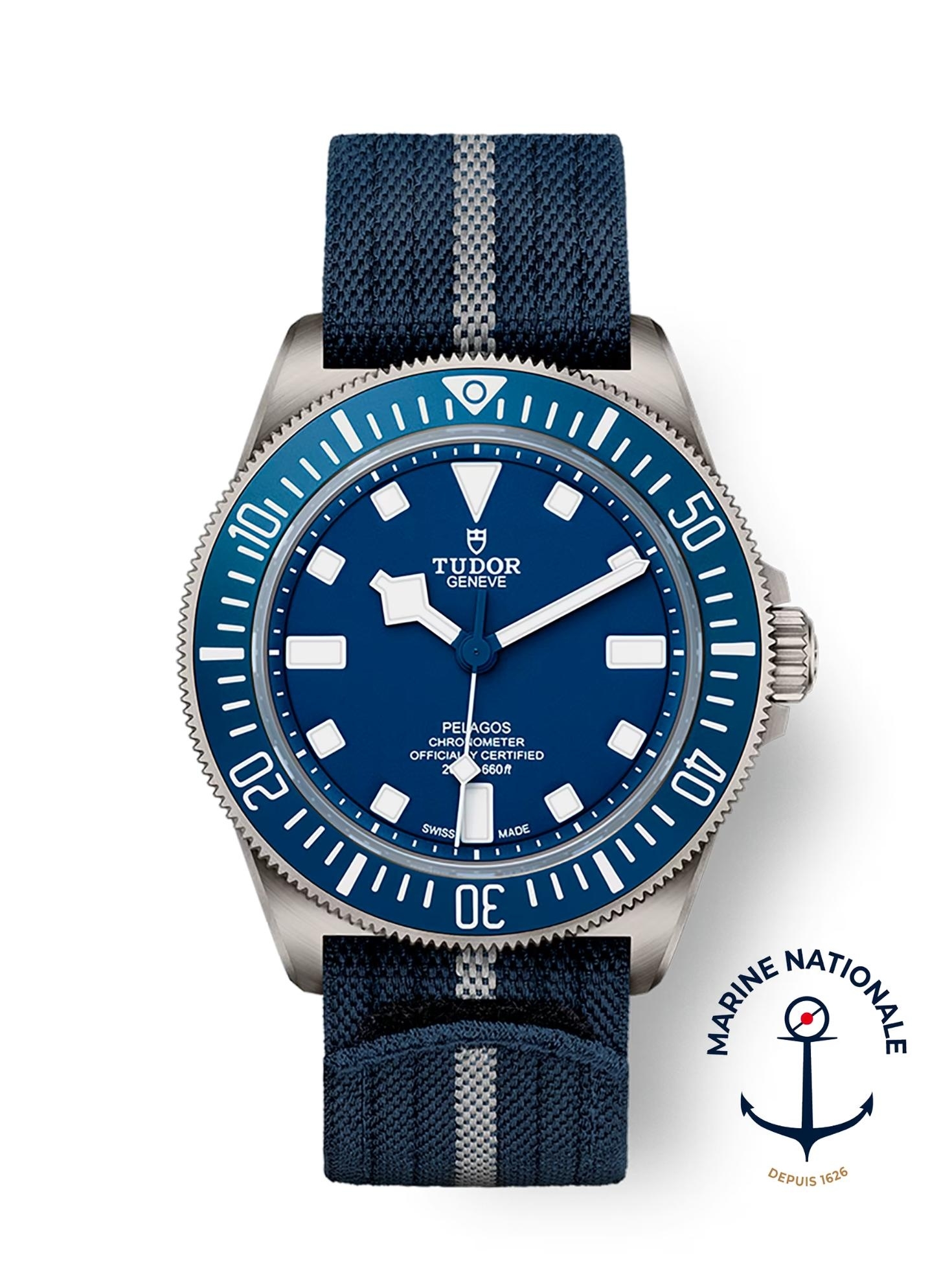 The Pelagos FXD M25707B/26-0001 is delivered with a marine-blue fabric strap featuring a grey central stripe and a hook-and-loop fastening system. An additional marine-blue rubber strap with a woven motif and titanium buckle is included.