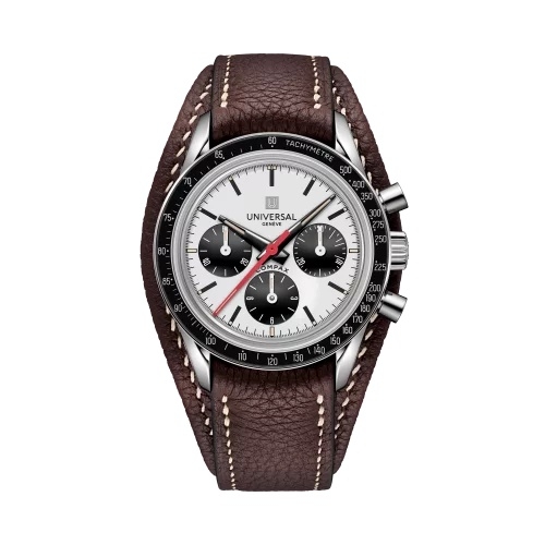 The Universal Genève Tribute to Compax JU281121A1X1 debuted in 2025 as part of a six-piece collection paying homage to the Compax chronograph famously worn by Nina Rindt during the 1960s. The watch features a 36 mm case crafted from 18 k white gold, measuring 12.67 mm in thickness and 44.44 mm from lug to lug. The fixed aluminum bezel incorporates a tachymeter scale, while the cambered sapphire crystal—treated with double-sided anti-reflective coating—covers a grand feu enamel dial executed in opaque white with contrasting black enamel chronograph counters.