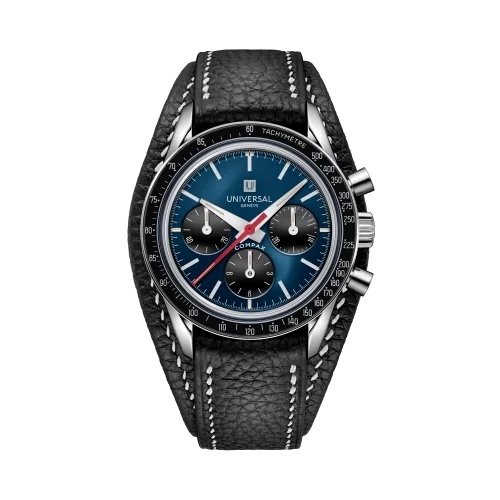The Universal Genève Tribute to Compax JU281121C1X1 debuted in 2025 as part of Universal Genève’s modern revival of its Compax line. The watch features a 36 mm case in 18 k white gold, 12.67 mm thick, fitted with a fixed aluminum tachymeter bezel and a sapphire crystal on both sides. The translucent blue grand feu enamel dial is paired with black enamel subdials and white varnished counter hands, complemented by rhodium-plated hour and minute hands and a red varnished central chronograph seconds hand.